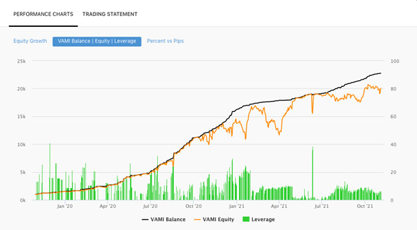 In this chart, you can see the VAMI Balance line in black, and the VAMI equity line in orange. When you see the orange line below the black line, equity is negative, and vice versa.