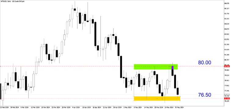 WTIUSD (Daily). Failing to break the 80.00 resistance level, crude oil returned to its support level. It is expected to continue to trade between 76.50 and 80.00 in the near term.