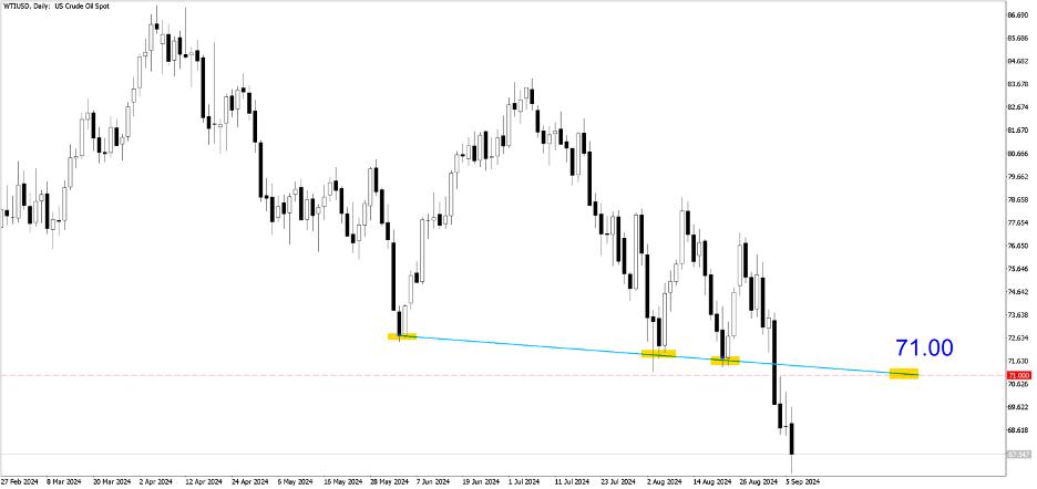 WTIUSD (Daily). The price finally broke through the dynamic support level last week, around $71 per barrel. We believe that supply and demand factors will drive the price back to 71.00, where it will possibly face some resistance.