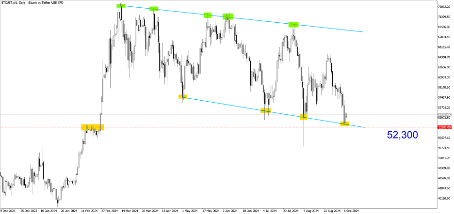 BTCUSD (Daily). In 2024, Bitcoin reached a new all-time high of 73,000 but entered a bearish projection channel. Price respects the upper and lower bands, but is expected to approach 52,300, a key area where buyers are likely to accumulate.