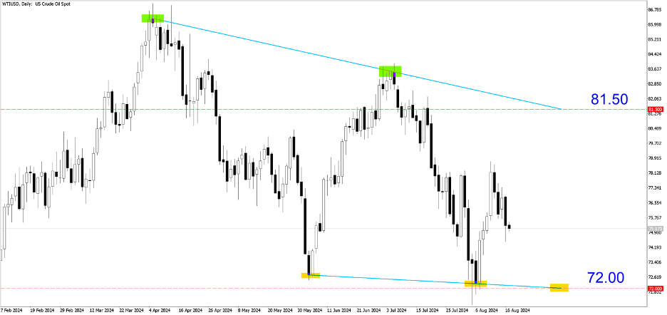 WTIUSD (Daily). Since April’s high of USD 86 per barrel, the commodity has been trading lower and the bearish projection line suggests the price will touch the lower band at 72.00 before bouncing back.
