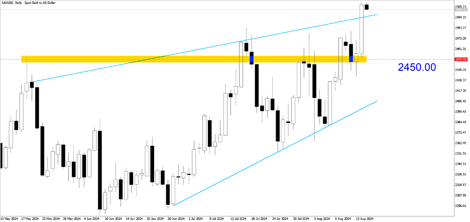 XAUUSD (Daily). 2500 is a strong psychological level, we believe investors are starting to see a direction in the long term. Price has closed above the bullish projection line, but there could be a correction to 2450, a liquidity level in the last 3 months.