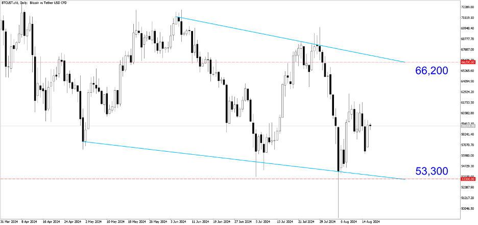 BTCUSD (Daily). Looking at the bearish projection line, the price is likely to retest the dynamic support level near 53,300. However, Bitcoin has a chance to bounce back to the upper range again around 66,200. We expect the market to be trading within this range.