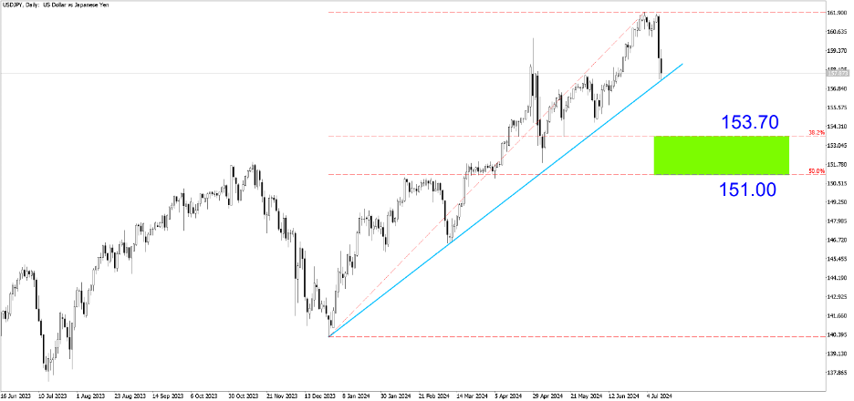 USDJPY (Daily). Yen is expected to continue to strengthen. If the price could break the bullish projection line starting in January 2024, the USDJPY could continue to the 38.2% and 50% Fibonacci levels around 151.00 and 153.70 respectively.