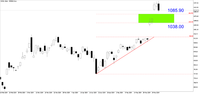 NVDA (Daily). Broke major resistance at 960.00, the stock price goes to the moon. Pay attention to both gaps last week due to potential corrections or Fibonacci expansion levels of 138.2% and 161.8% at 1038.00 and 1085.90 for ideal buying entries.