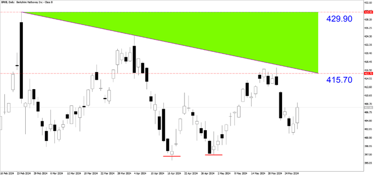 BRKB (Daily). Rising from the double bottom this month, shares are trying to break through the projected resistance of around 415.70. If the price breaks through, it could reach 429.90 as the next major resistance.