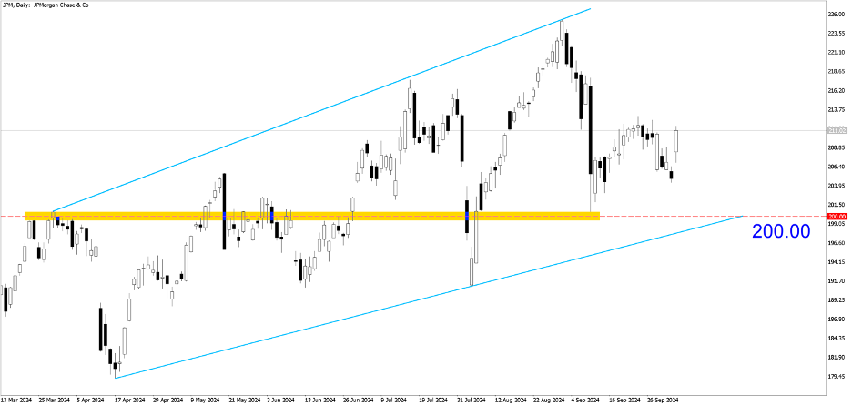 JPM (Daily). The stock has shown bullish momentum over the past 6 months, outlined by a projection line. We recommend buying near the 200.00 level, where it rebounded previously.