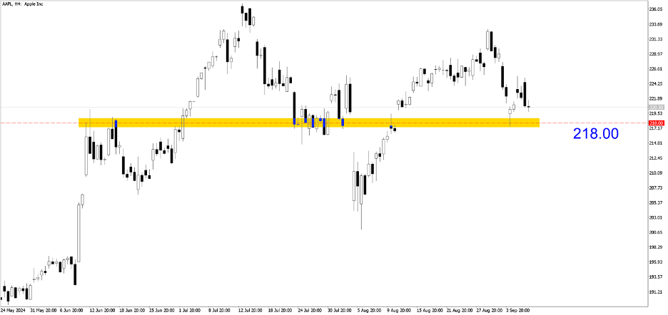 AAPL (H4). Over the past 4 months, Apple has shown a liquidity zone at around 218.00. When the price fails to break this level, it tends to reverse. Currently, the price is near this level again and may present us with a buying opportunity.