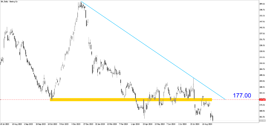 BA (Daily). Looking at the bearish projection line (blue), Boeing has declined by 40% over 177 trading days. The price often consolidates around 177.00, indicating a fair value for the stock. This could be a good opportunity to buy.