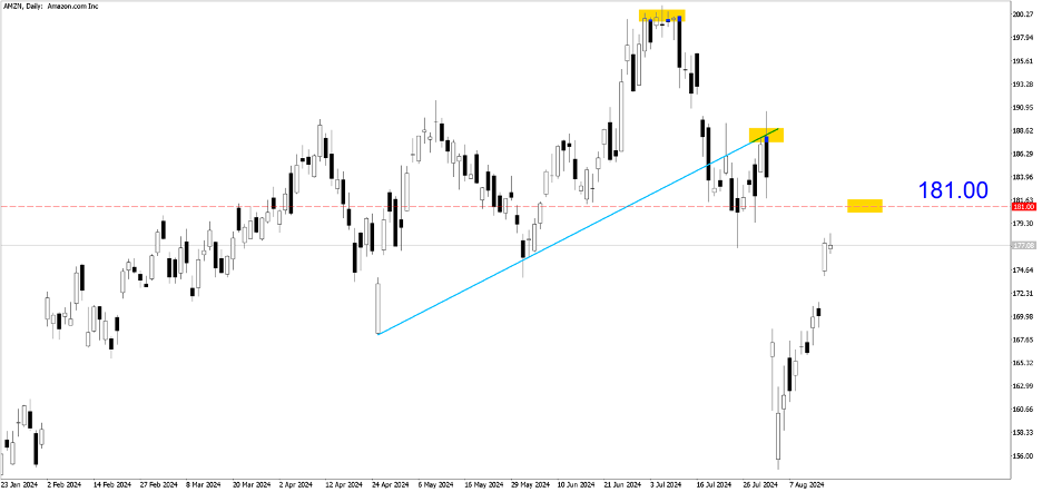 AMZN (Daily). After breaking the bearish projection line and dynamic support turned resistance, price experienced a significant gap-down in early August. We see the price rebound and will reach a lower-high around 181.00 before continuing the bearish move.