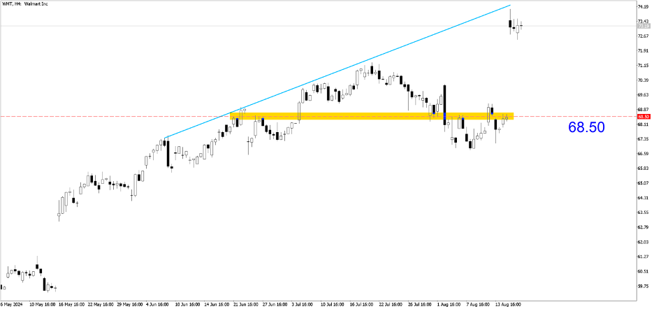 WMT (H4). After the stock split in February 2024, this is the highest point Walmart has reached. We see a clear bullish projection line, but the price may return to the weekly pivot around 68.50 before flying above the 70.00 level again.