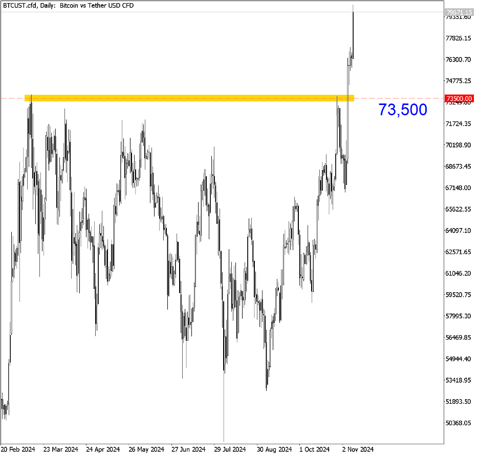 BTCUSD (Daily). During the election, Bitcoin surged by $5,000 and now is hitting another all-time high. The bullish momentum is strong, with potential buying opportunities on market dips.