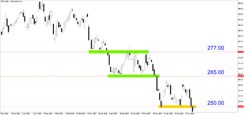 MCD (Daily). Membuat grid yang jelas dalam periode bearish, Mcdonald's diperkirakan akan bangkit kembali didukung oleh faktor fundamentalnya. Jika bertahan di atas 250.00 maka mengkonfirmasi formasi triple-bottom, target potensial berikutnya bisa di antara 265.00 dan 277.00.