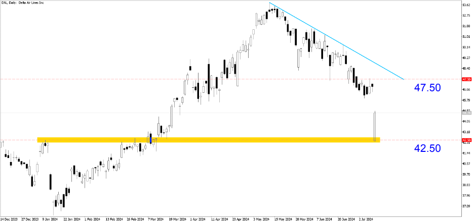 DAL (Daily). Turun 14% gap dari penutupan pasar sebelumnya, saham mengisi area ketidakseimbangan permintaan dan penawaran. Harga dengan percaya diri melonjak dan naik 2,25 poin hanya semalam. Pembelian direkomendasikan setelah harga menembus garis proyeksi bearish di sekitar 47.50.