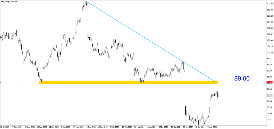 NKE (Daily). Sejak penutupan tahun lalu, harga telah anjlok 42% dari 123,35 menjadi 71,00, menunjukkan bahwa harganya berkinerja buruk sepanjang tahun. Level 89.00 menunggu saat support yang solid berubah menjadi resistance.