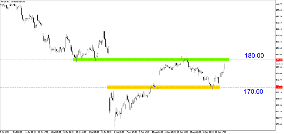 AMZN (H1). Mulai awal Agustus, harga saham naik 18% dari 155,60 menjadi 182,30. Kami memperkirakan Amazon akan menghadapi beberapa resistensi di 180.00 dan memiliki sedikit retracement menuju 170.00 sebelum bergerak naik lagi.