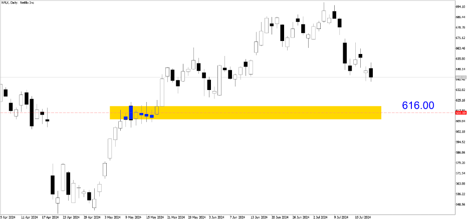 NFLX (Daily). Aksi ambil untung adalah normal setelah Netflix melonjak 27,5% selama 2,5 bulan terakhir. Koreksi diperkirakan hingga 50% dari level Fibonacci di 616.00, yang merupakan kemungkinan level pembelian kembali bagi investor.