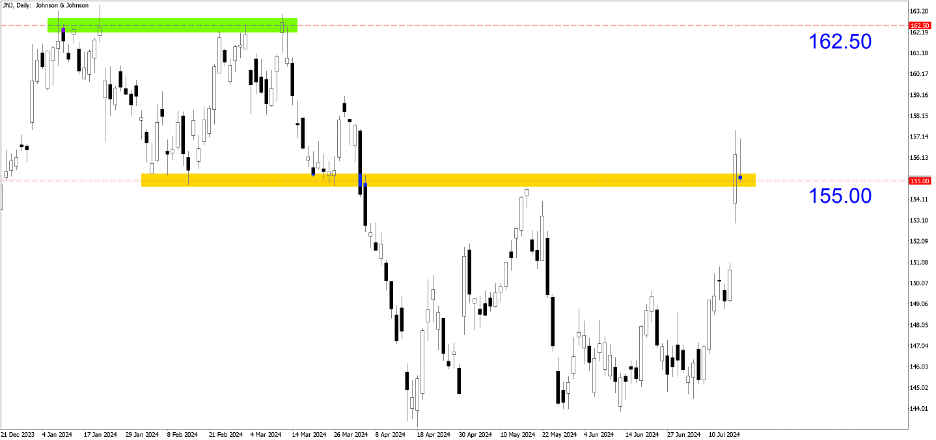 JNJ (Daily). Setelah triple-bottom ditembus pada awal April 2024, level 155.00 berubah dari support ke resistance. Setelah hampir 4 bulan perdagangan, permintaan yang solid mengirim saham ini ke atas 155.00 dan kami menargetkan level 162.50.
