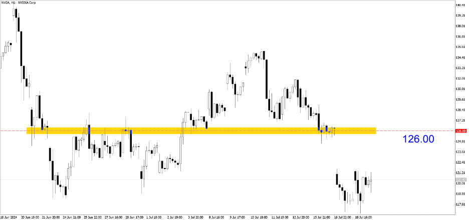 NVDA (H1). Harga turun dari level 126.00, tingkat demand dan supply yang dihormati para investor setelah stock-split. Saham ini dianggap murah dan kami memperkirakan harga akan kembali ke level 126.00.