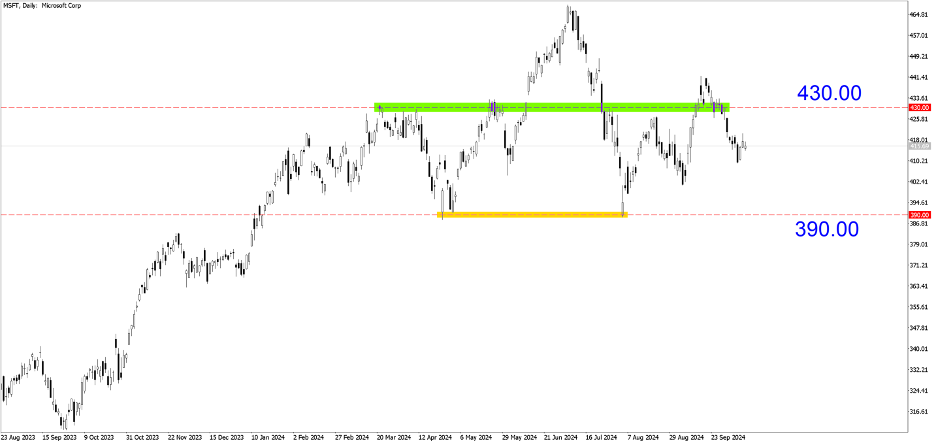 MSFT (Daily). Dengan resistance ditetapkan di 430.00 dan support kuat di 390.00, kami menyarankan untuk menjual di dekat zona hijau dan membeli di dekat zona kuning.