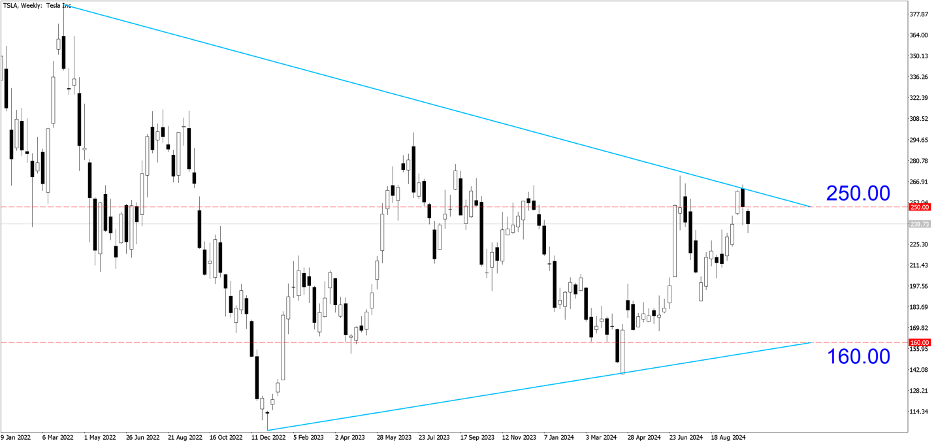 TSLA (Weekly). Setelah gagal menembus resistance di 250.00, saham telah kembali ke kisaran perdagangannya. Meskipun didorong oleh beberapa inovasi, kami percaya bahwa Tesla perlu mengalami pullback ke sekitar 160.00 sebelum dapat memperoleh momentum baru.