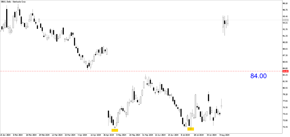 SBUX (Daily). Setelah membentuk pola double-bottom di level 72.50, harga saham melonjak. Namun, gap-up minggu lalu lebih dari 20%, dapat membuat koreksi yang masuk akal. Kami memperkirakan bahwa harga akan mengisi celah di sekitar 84.00 sebelum terus menguat.