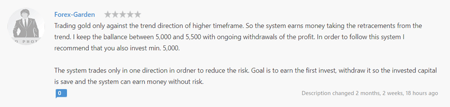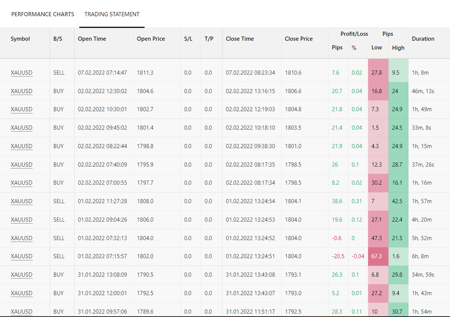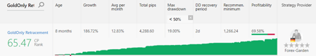 Đối với những người theo dõi chiến lược đang tìm kiếm một nhà cung cấp chiến lược rủi ro thấp có thể xem xét “GoldOnly Retracement”. Nếu bạn nhìn vào báo cáo giao dịch của anh ấy, bạn sẽ nhận thấy rằng anh ấy là một nhà giao dịch trong ngày với lợi nhuận trung bình của họ là 4,58 pips. Một điểm thuận lợi là anh ấy đặt lệnh cắt lỗ cho hầu hết các giao dịch của mình.