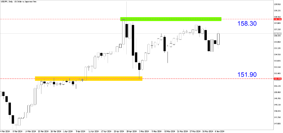 USDJPY (Hàng ngày). Có biến động không đáng kể vào tuần trước, cặp tiền này vẫn bị mắc kẹt trong phạm vi rộng trong 3 tháng qua. Chờ đợi sự đột phá ở mức kháng cự 158,30 để có cơ hội mua hoặc mô hình từ chối để có cơ hội bán.