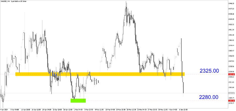 XAUUSD (H4). Đã vượt qua thành công mức hỗ trợ mạnh mẽ tại 2325,00. Vàng sụt giảm vào thứ Sáu khi triển vọng cắt giảm lãi suất giảm. Giá có thể sẽ kiểm tra lại mức đáy đôi và sẽ có khả năng mua vào khoảng 2280,00.