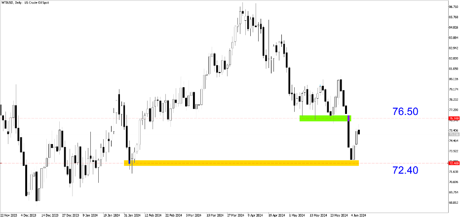 WTIUSD (Hàng ngày). Dầu thô đã phá vỡ mức hỗ trợ 76,50 vào ngày giao dịch đầu tiên của tháng 6 và phục hồi từ mức hỗ trợ tiếp theo ở mức 72,40. Chúng tôi kỳ vọng dầu thô sẽ được giao dịch trong phạm vi giá này trong thời gian tới.