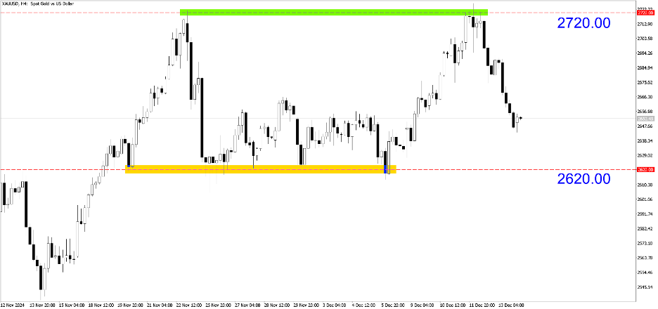 XAUUSD (H4). Trong 20 ngày giao dịch vừa qua, vàng đã hợp nhất trong phạm vi giữa vùng cầu là 2.620,00 đô la và vùng cung là 2.720,00 đô la. Biến động giá trong tháng 12 dự kiến sẽ có xu hướng giảm, tạo cơ hội cho các giao dịch bán khống trong phạm vi này.