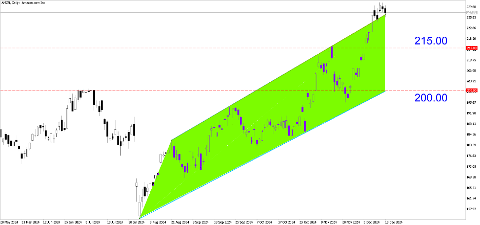 AMZN (Daily). Trong 5 tháng qua của năm 2024, Amazon đã giành lại vị trí dẫn đầu. Mặc dù theo xu hướng tăng giá, giá cổ phiếu có vẻ quá nóng vào tuần trước. Chúng tôi dự đoán sẽ có sự điều chỉnh, với mức hỗ trợ có khả năng hình thành quanh mức 200,00 đến 215,00, phù hợp với các đỉnh trước đó.