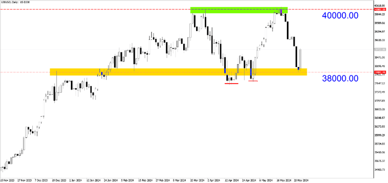 US30 (Hàng ngày). Chỉ số Dow Jones đạt đỉnh kép ở mức cao nhất mọi thời đại là 40.000,00. Chúng tôi đang chờ đợi sự điều chỉnh ở mức tâm lý 38.000,00 để có mức mua tốt hơn trong tháng Sáu.