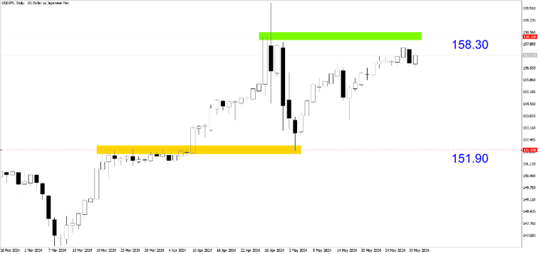 USDJPY (Hàng ngày). Bất chấp sự can thiệp của chính phủ, xu hướng tăng của cặp tiền vẫn đi đúng hướng. 158,30 sẽ là mức để xem xét bán khống cặp này. Với tư cách là nhà giao dịch, chúng tôi luôn tuân theo ý định của ngân hàng trung ương.