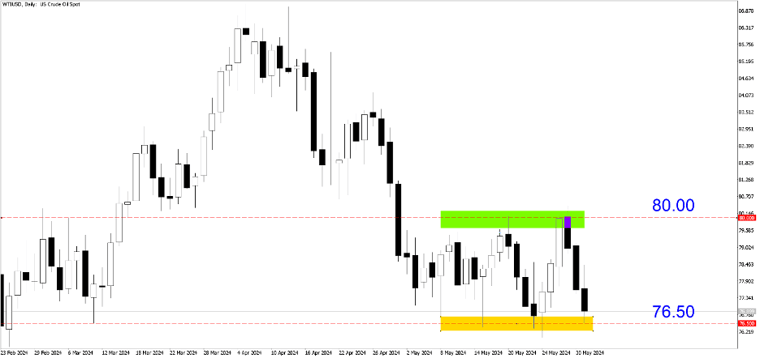 WTIUSD (Hàng ngày). Không thể phá vỡ ngưỡng kháng cự 80,00, dầu thô quay trở lại mức hỗ trợ. Dự kiến nó sẽ tiếp tục giao dịch trong khoảng từ 76,50 đến 80,00 trong thời gian tới.