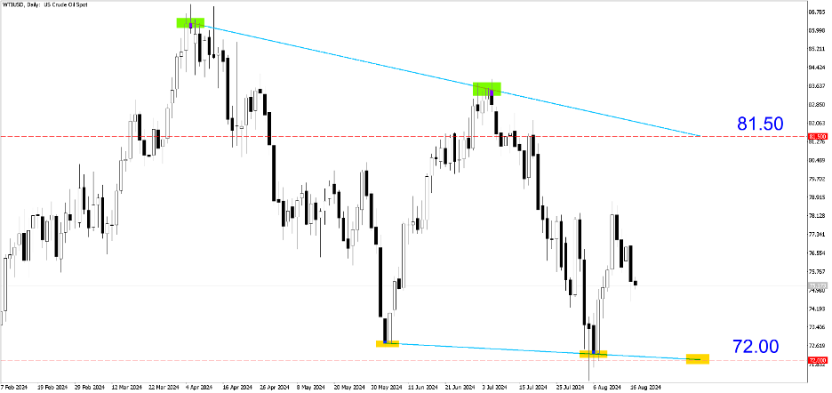 WTIUSD (Daily). Kể từ mức cao nhất là 86 đô la một thùng vào tháng 4, mặt hàng này đã giao dịch ở mức thấp hơn và đường dự báo giảm giá cho thấy giá sẽ chạm mức thấp hơn là 72,00 trước khi phục hồi.