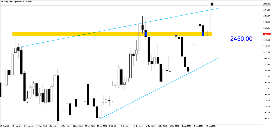 XAUUSD (Daily). 2500 là mức tâm lý mạnh, chúng tôi tin rằng các nhà đầu tư đang bắt đầu thấy được hướng đi trong dài hạn. Giá đã đóng cửa trên đường dự báo tăng giá, nhưng có thể sẽ có sự điều chỉnh xuống 2450, mức thanh khoản trong 3 tháng qua.