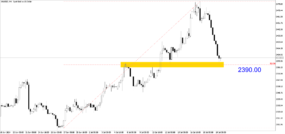 XAUUSD (H4). Sau khi tăng vọt lên trên 2.400, Vàng đóng cửa tuần ở mức 2.400. Chúng tôi kỳ vọng giá sẽ bật lên từ mức hỗ trợ khoảng 2390.