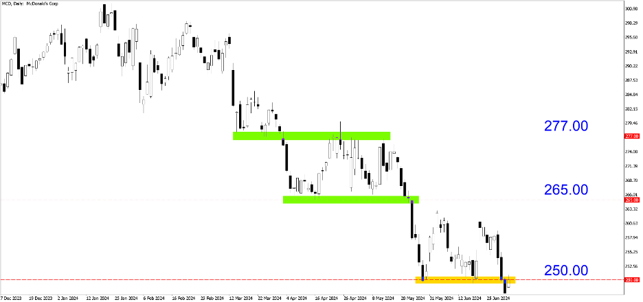 MCD (Hàng ngày). Tạo ra một mạng lưới rõ ràng trong giai đoạn giảm giá, Mcdonald's dự kiến sẽ phục hồi trở lại nhờ yếu tố cơ bản của nó. Nếu nó vượt lên trên 250,00 để xác nhận sự hình thành ba đáy thì các mục tiêu tiềm năng tiếp theo có thể là 265,00 và 277,00.