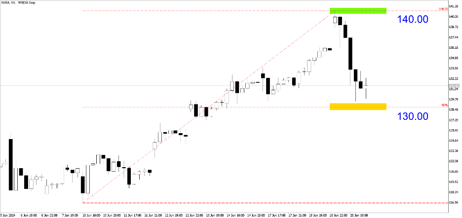 NVDA (H1). Nvidia đã có động thái tăng giá sau đợt chia cổ phiếu 10 tặng 1. Nó có sự điều chỉnh đột ngột trên biểu đồ hàng giờ, cổ phiếu này được dự đoán sẽ bật lên từ mức 130,00 và lấy đà để phá vỡ ngưỡng kháng cự tại 140,00.