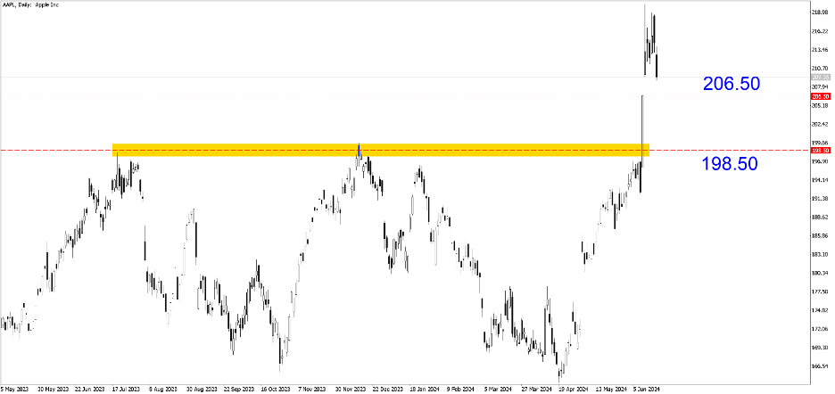 AAPL (Hàng ngày). Sau khi vượt qua ngưỡng kháng cự vững chắc trong năm qua vào một ngày giao dịch sôi động, Apple dự kiến sẽ điều chỉnh về khu vực từ 198,50 đến 206,50.