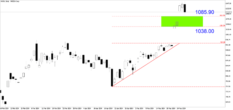 NVDA (Hàng ngày). Phá vỡ ngưỡng kháng cự chính ở mức 960,00, giá cổ phiếu tăng vọt. Hãy chú ý đến cả hai khoảng trống trong tuần trước do khả năng điều chỉnh hoặc mức mở rộng Fibonacci là 138,2% và 161,8% tại 1038,00 và 1085,90 để có các điểm mua lý tưởng.
