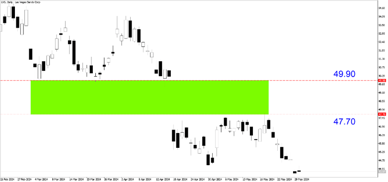 LVS (Hàng ngày). Las Vegas Sands Corp. có nhiều tiềm năng tăng trưởng mặc dù giao dịch thấp hơn kể từ tháng Tư. Về mặt kỹ thuật, giá có thể tiến tới mất cân bằng cung cầu giữa 47,70 và 49,90 trong vài tuần tới.