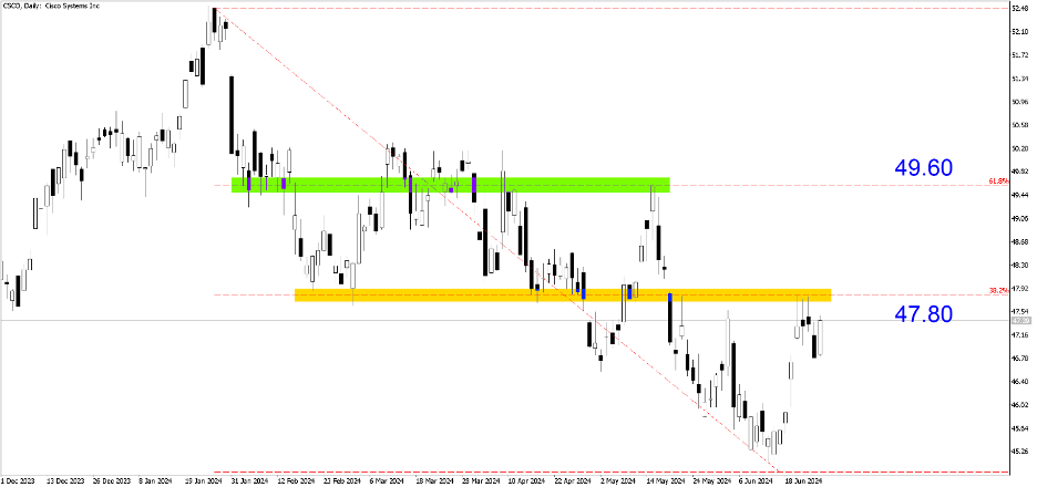 CSCO (Hàng ngày). Trong giai đoạn giảm giá kể từ đầu năm nay, sự đảo chiều cuối cùng đã lấy được động lực. Dựa trên các mức Fibonacci 38,2% và 61,8% vốn là vùng cung và cầu, cổ phiếu này dự kiến sẽ phá vỡ mức 47,80 và hướng tới mức 49,60.
