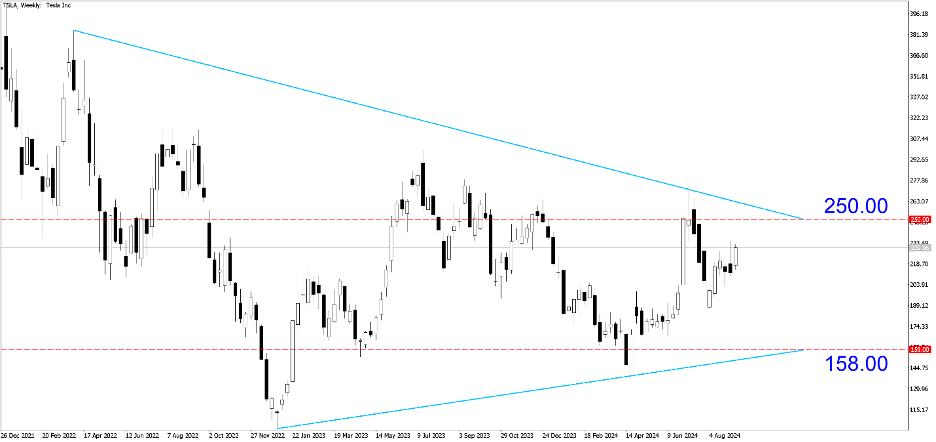 TSLA (Weekly). Trải qua nhiều lần tăng giảm, cổ phiếu này đã hình thành mô hình tam giác và dự kiến sẽ tiếp cận dải trên ở mức 250,00. Dự kiến sẽ có sự điều chỉnh trong những tuần tới.