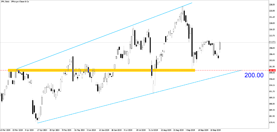 JPM (Daily). Cổ phiếu đã cho thấy động lực tăng trong 6 tháng qua, được xác định bởi một đường dự báo. Chúng tôi khuyến nghị mua gần mức 200,00, nơi cổ phiếu đã bật tăng trước đó.