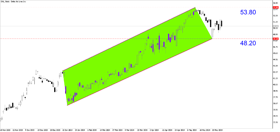 DAL (Hàng ngày). Được giao dịch trong xu hướng tăng giá rất suôn sẻ từ đầu năm 2024 đến nay, cổ phiếu này vẫn có tiềm năng tăng giá. Đợi sự điều chỉnh hợp lý về mức 48,20 và nhắm mục tiêu mức cao nhất 53,80.