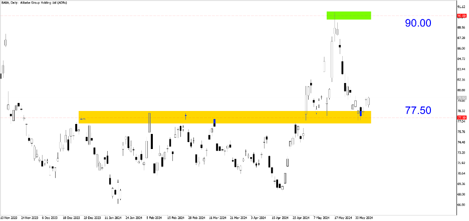 BABA (Hàng ngày). Cổ phiếu này có vùng cung và cầu rõ ràng. Nhắm đến mức cao ở mức 90,00 với giới hạn mua khoảng 77,50, mức kháng cự vững chắc kể từ tháng 12 năm 2023 và trở thành mức hỗ trợ kể từ tháng 5 năm 2024.