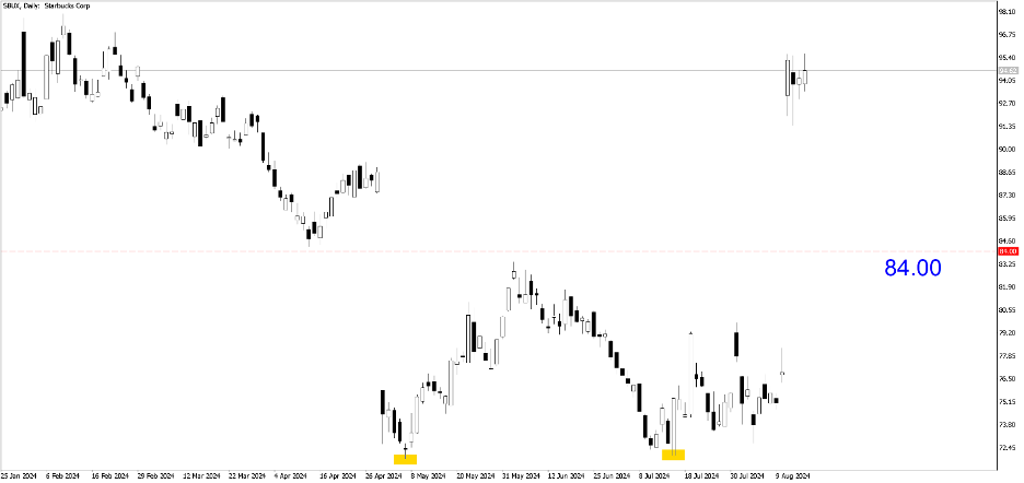 SBUX (Daily). Sau khi hình thành mô hình đáy kép ở mức 72,50, giá cổ phiếu đã tăng vọt. Tuy nhiên, mức tăng hơn 20% của tuần trước có thể tạo ra sự điều chỉnh hợp lý. Chúng tôi ước tính rằng giá sẽ lấp đầy khoảng cách quanh 84,00 trước khi tiếp tục tăng mạnh.