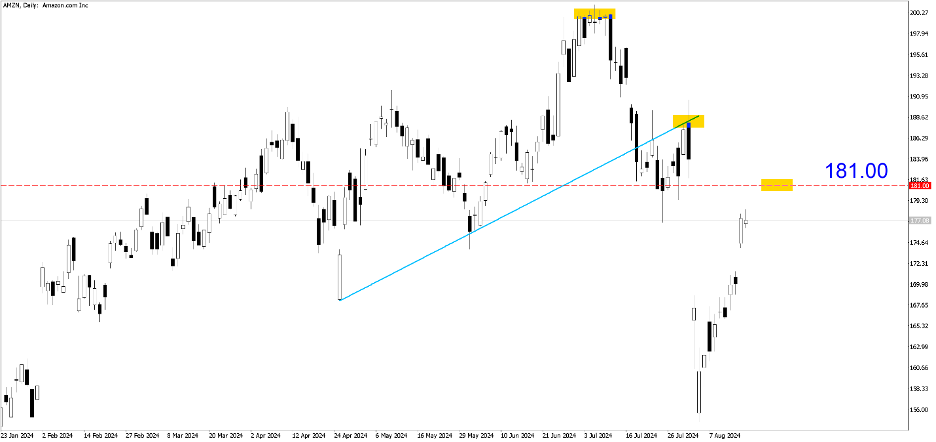 AMZN (Daily). Sau khi phá vỡ đường dự báo giảm giá và hỗ trợ động chuyển thành kháng cự, giá đã giảm đáng kể vào đầu tháng 8. Chúng tôi thấy giá phục hồi và sẽ đạt mức cao thấp hơn khoảng 181,00 trước khi tiếp tục xu hướng giảm.